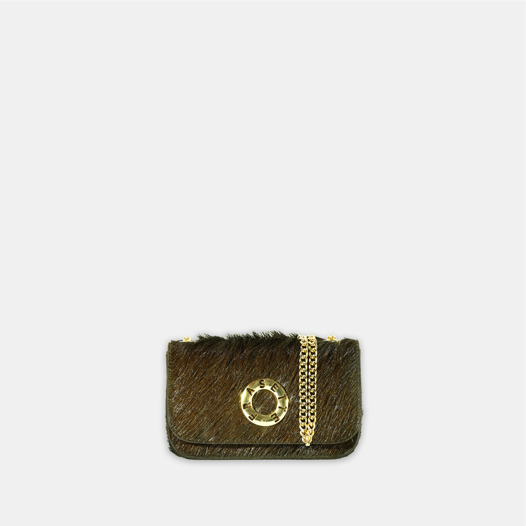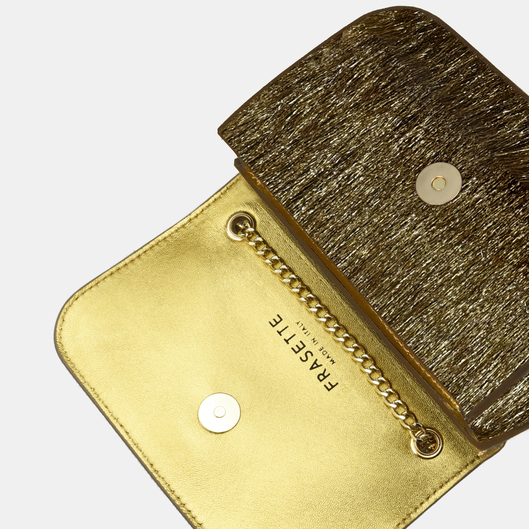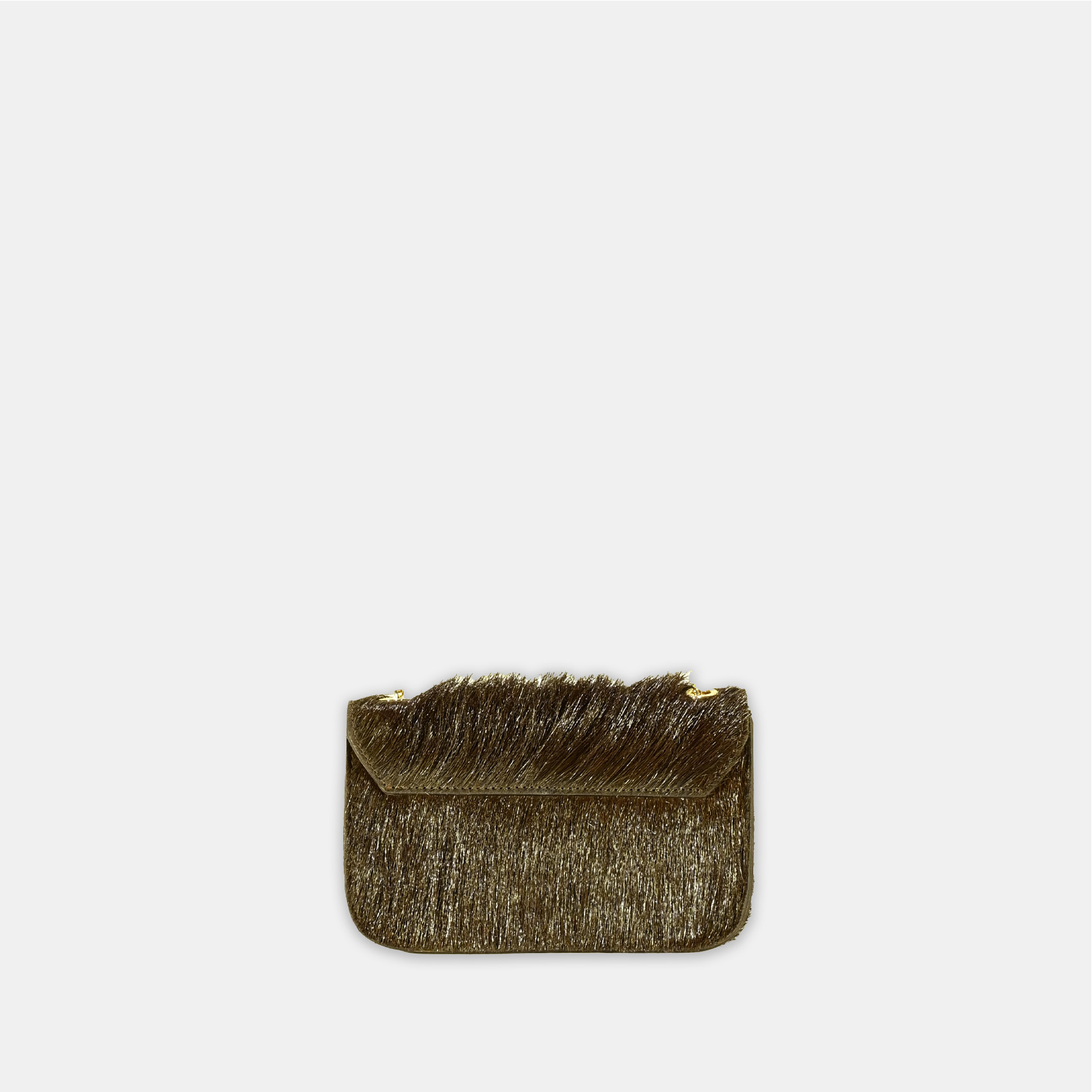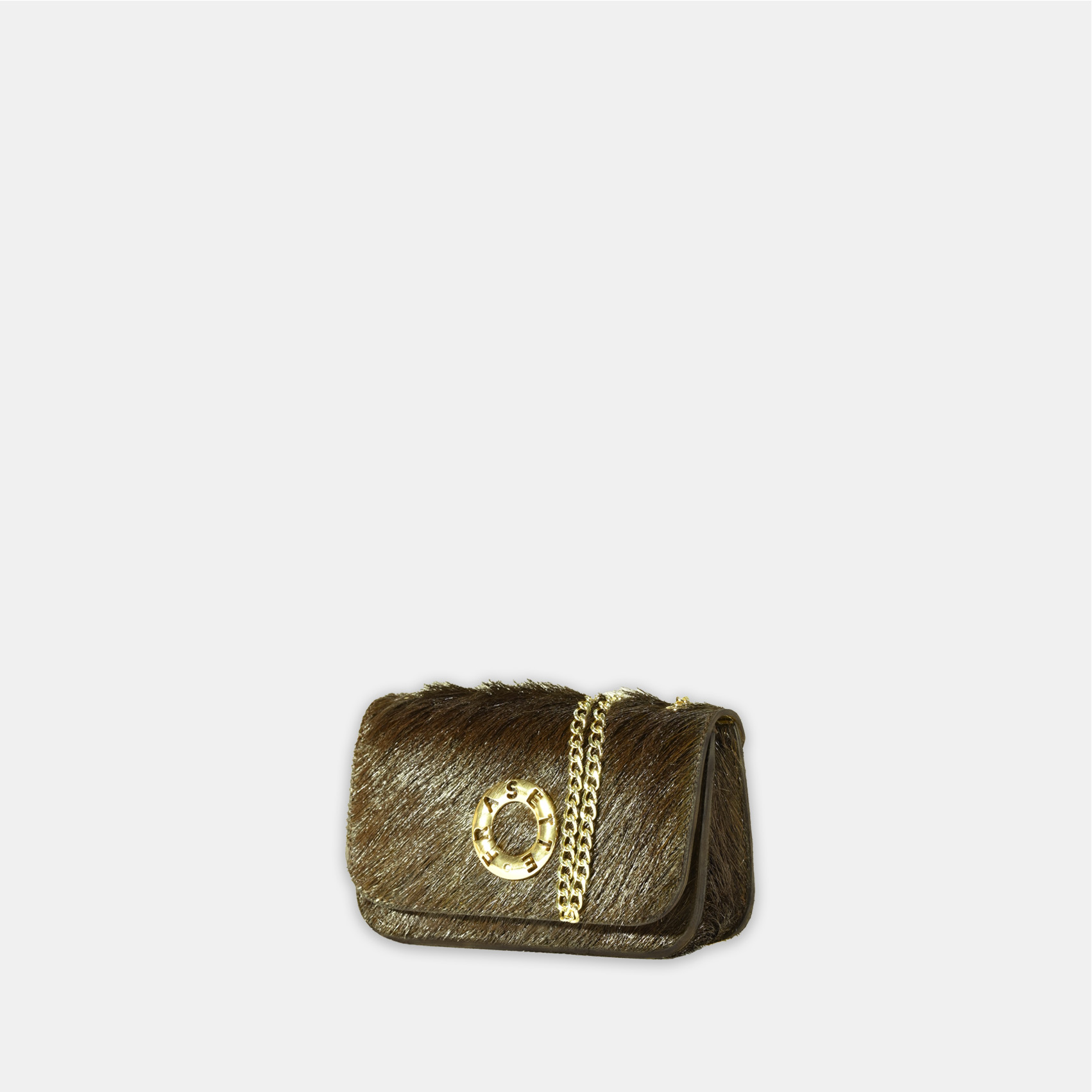 Realizzata con base e patta in pelle cavallino marrone e fodera, sempre in vera pelle oro, questa mini-bag con catena e accessori oro, sarà la scelta giusta per completare il tuo look.