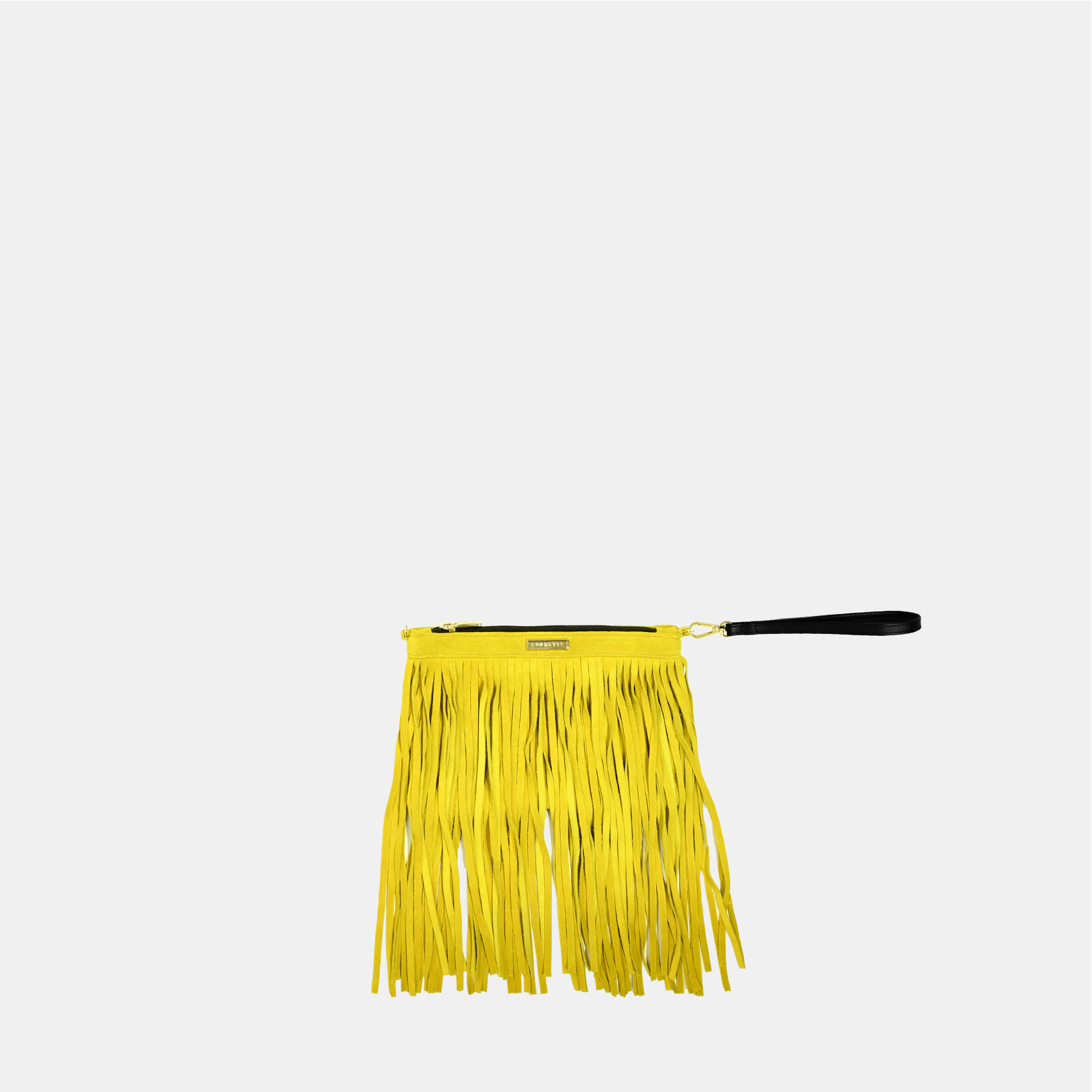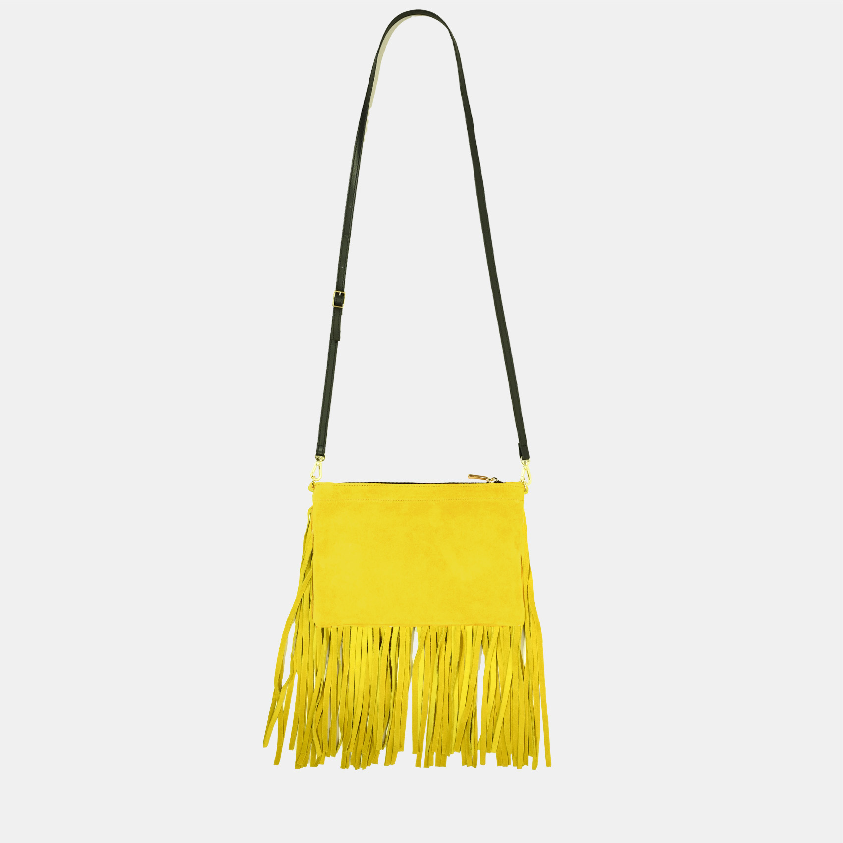 Questa borsa è realizzata in pelle scamosciata senape con frange, dettagli in pelle nera e accessori oro.